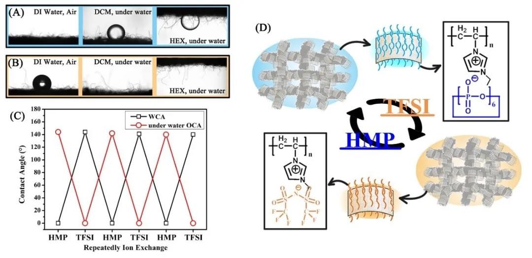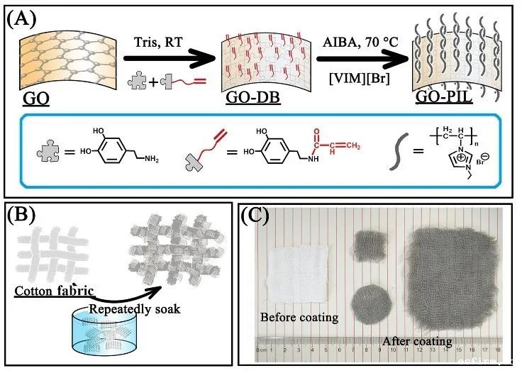 近日,四川大学赵长生教授课题组利用离子液体聚合物(PIL)通过离子交换可以实现亲水-疏水性质转换的特性,制备了亲疏水性可切换的双向油水分离材料。相关论文以“Design of poly ionic liquids modified cotton fabric with ion species-triggered bidirectional oil-water separation performance”为题发表在《Journal of Hazardous Materials》上。研究人员以棉织物为基材,首先将PIL以自由基聚合的方式接枝在氧化石墨烯(GO)片层上,之后通过涂覆的方式将由PIL改性的GO引入到棉织物的纤维表面。