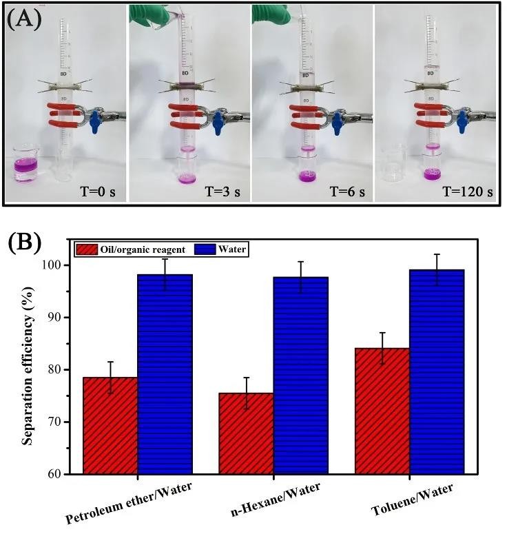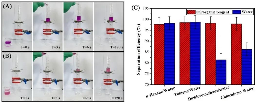 当交换对应离子使棉布切换为疏水状态时,棉布则可以有效截流油水混合液中的水相:分离实验过程中,油相将在数秒钟内快速流过棉布,而水相将被阻隔。同时,这种切换功能具有较好的稳定性和可重复性。