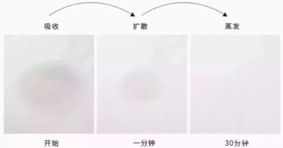 滴水法滴加的水分只与纺织品局部接触,局部水分含量高,且整体扩散面积小,因此水分挥发慢,烘干时间长,而机洗法中所有水分可均匀分散在整个样品的表面以及每根纤维间隙中,烘干更快。越厚重的织物采用这两种方法进行比较测试时,差距会越大。