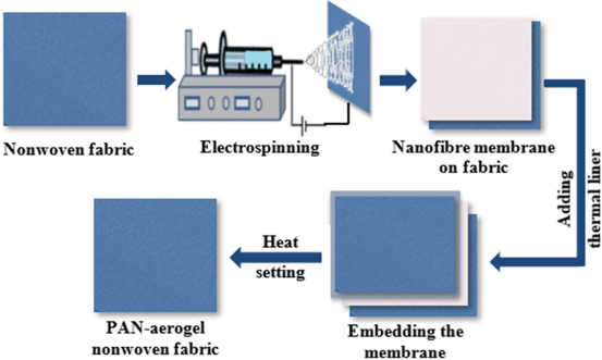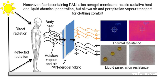 首先,研究者通过将二氧化硅气凝胶颗粒整合到PAN溶液中,利用静电纺丝技术成功制备了PAN-二氧化硅气凝胶纳米纤维膜。然后将该纳米纤维膜夹在两层粘胶纤维针刺非织造材料中,通过热定形制备出同时具有阻隔性能和热舒适性的复合防护服材料。