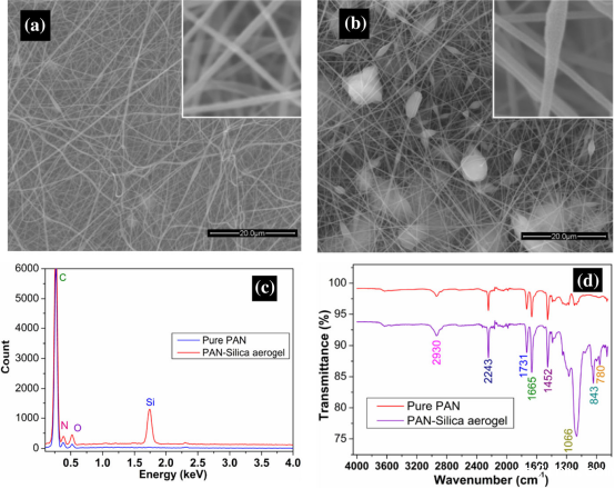 通过对PAN-二氧化硅气凝胶纳米纤维膜的形态表征发现,气凝胶颗粒均匀分布在膜中,能够为防护服面料提供功能特性。