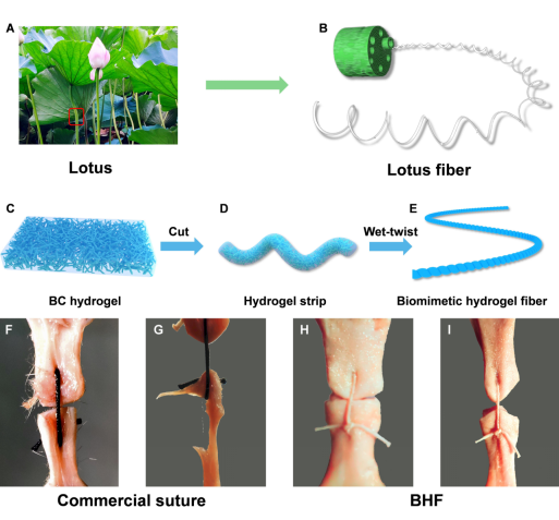 近期,中国科学技术大学俞书宏院士团队基于“藕断丝连”这一自然现象,深入探究了莲丝纤维的微观结构与力学性能,并受此启发研制出了一种可用于手术缝线的仿莲丝细菌纤维素水凝胶纤维。