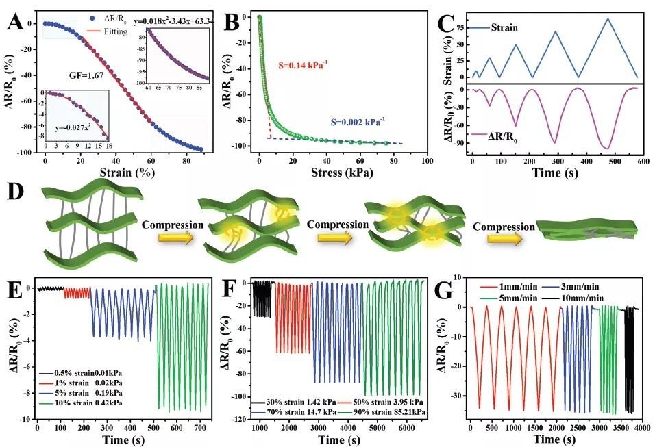 而基于导电聚合物复合材料(conductive polymer composites,CPC)的压阻式压力传感器,结构简单、柔韧性好且便于收集信号。施加外部压力的情况下,会立刻引起导电聚合物复合材料内部导电网络的重新排列,从而导致电阻的变化。而具有典型三维结构的导电聚合物复合材料由于其低密度、高孔隙率和良好的弹性被认为是压阻式传感器的理想选择。