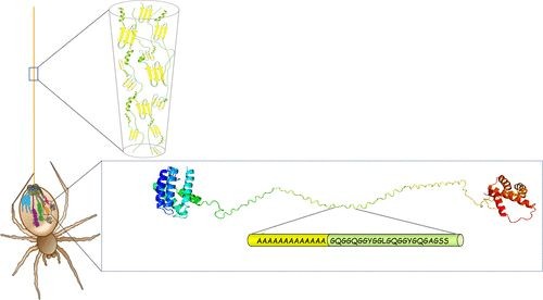 一般情况下,每一只蜘蛛都可以创造出7种不同的丝质纤维,并且每一种纤维的机械性能均不相同。这些丝质纤维主要是由蛛丝蛋白组成,它们共享含有110-130个氨基酸的重复区球状终端域。这些在蛛丝蛋白中的终端域都是独一无二的,并且能够调节蛛丝的溶解度以及控制纤维的形成,重复区则能够控制蛛丝的机械性能。其中,最坚硬的丝质纤维(dragline)主要由大壶状腺丝蛋白(MaSps)构成,其重复区域主要含有迭代多聚丙氨酸(poly-Ala)段和富含甘氨酸(Gly)的重复区。在蜘蛛的丝腺中,蛛丝蛋白的浓度高达50%(w/v)左右。尽管我们尚未完全理解蜘蛛是如何将蛛丝蛋白保持在这样高的一个浓度而不产生沉积,但是现今所知晓的是,其储存模式主要是将重复区以随机盘绕的方式储存在丝腺内,并且α螺旋终端域会使蛛丝蛋白保有一定的亲水性,它主要附着在丝腺内部的表层来帮助存储。蛛丝纤维的合成主要在输送管内进行,其中包括pH值的降低和相对剪应力的增加,从而拉挤成形并最终形成蛛丝蛋白。更加有趣的是,蛛丝蛋白中的N与C终端域在合成时会起到“锁定与引发”的作用。N终端域在pH值降低时会二聚化,从某种程度上这类似于网状结构的耦合作用,从而锁定蛛丝蛋白。C终端域则会在pH值和剪应力的影响下形成β-片状核,从而促进氨基酸重复区转化成β-片状核状。最终这种“锁定与引发”机制最终能够将液体状的蛛丝蛋白转化成固体状的纤维。