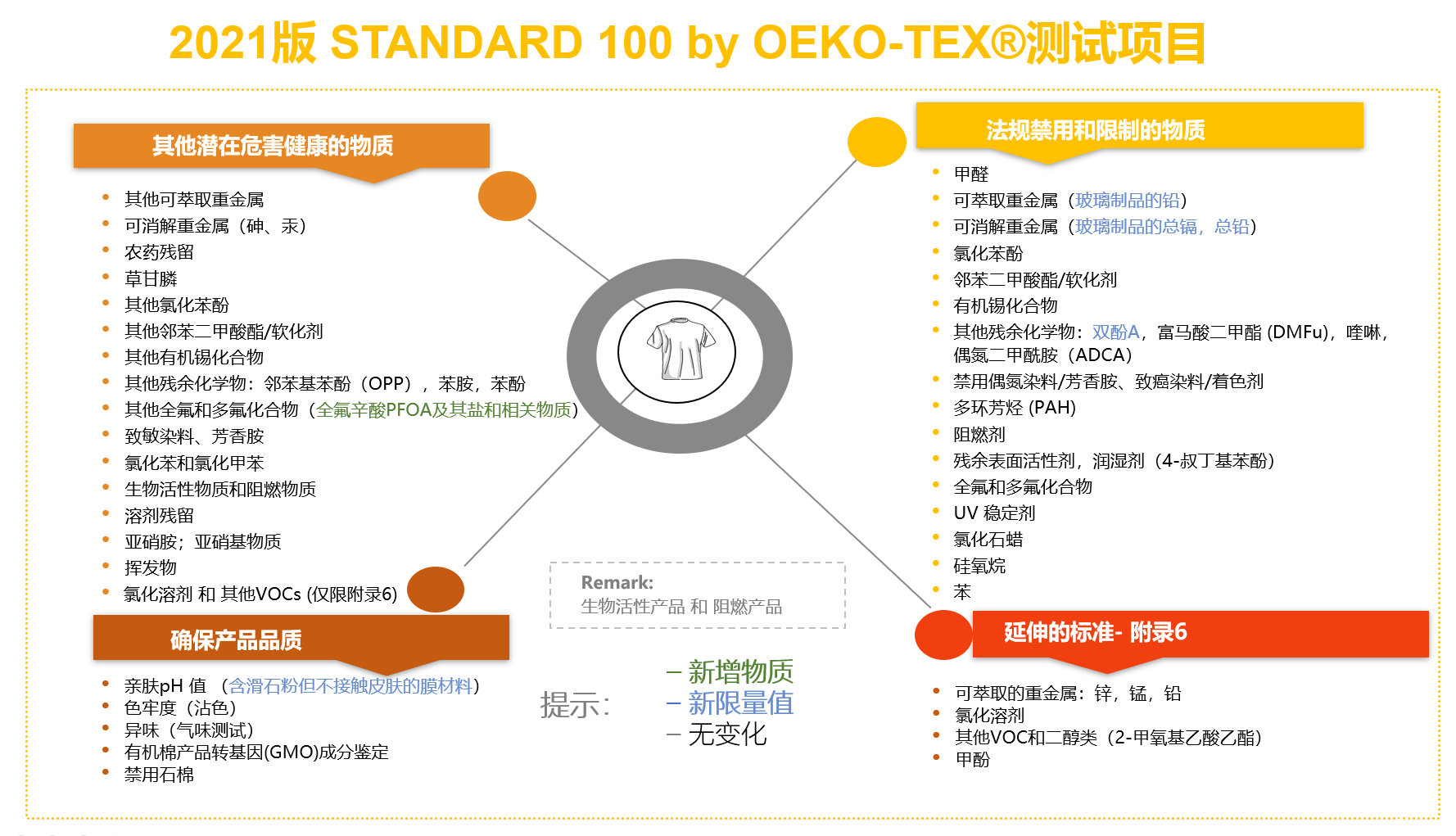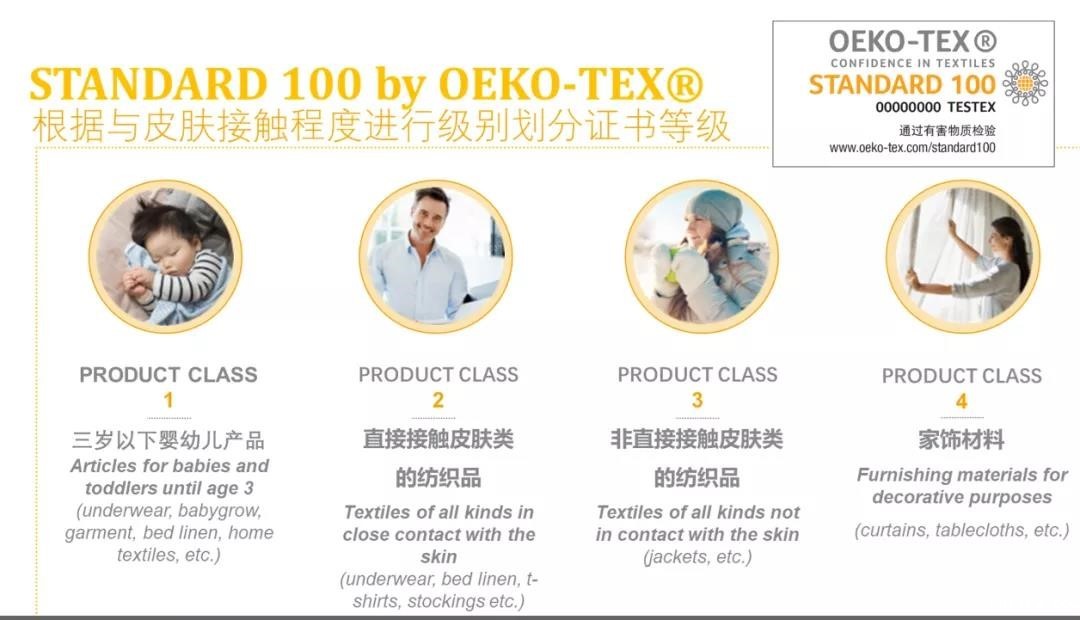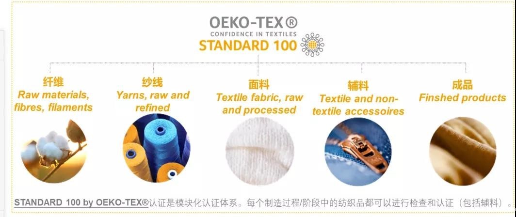 原则上,所有加工阶段的纺织品,从纱线到面料、辅料及成品,都适用于STANDARD 100认证。每种不同的产品都必须根据其产品特性、加工工艺、所使用的染化料的不同,达到所对应检测项目的限量值要求。