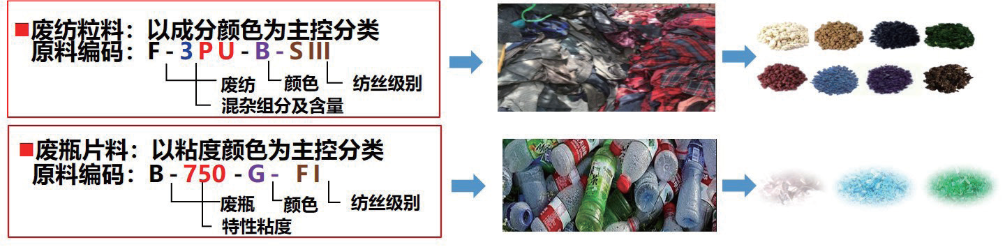 “分”:废旧聚酯资源化,标准化分类垃圾。建立废旧聚酯资源分类分级评价体系,确保再生品质;废纺粒料以成分、颜色为主控分类;废瓶片料以黏度、颜色为主控分类。废弃纺织品分类对接产业上游,建成废弃纺织品分类回收及粒料专供生产基地,将废弃纺织品封闭连续化水热协同造粒,品质较同类产品提升50%以上,无扬尘污染;废弃塑料瓶全自动近红外正分,清洗水套用,污水处理后循环利用,每吨废弃塑料瓶水耗降至1t。