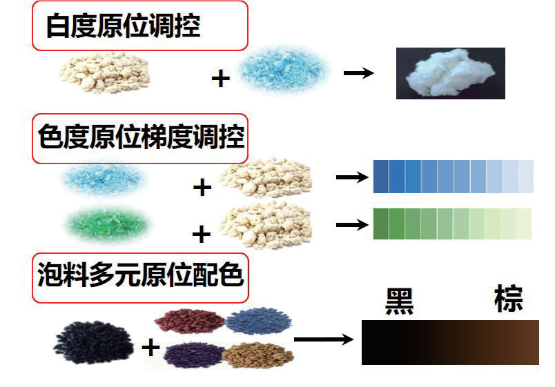 “专”:面向多领域应用的专业化定制。将废旧聚酯混杂组分原位利用,如泡料和瓶片配色、混杂体系稳定化,经过专业化定制,实现在线功能化改性、在线补色调色,可制备专业应用的有色纤维,色差及色牢度优于原生纤维,且免去后续染色工艺,在服用面料、家纺内饰、针刺土工布、车用纺织品、鞋用面料领域得到成功应用,全面满足专业应用需求。
