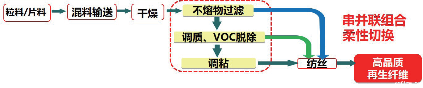 “调”:熔体品质三位一体高效调控。高品质再生纤维是废弃纺织品循环再生的关键,对于生产工艺有着严格要求。熔体过滤、调质、调黏进行串并联组合,在生产中可以根据原料的再生要求柔性切换,从而实现熔体品质三位一体高效调控,对提高再生纤维品质意义重大。