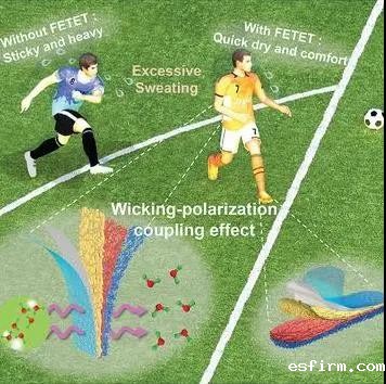 近日,东华大学的研究团队制造了一种铁电增强型摩擦电蒸发织物(FETET),其包括铁电增强型纳米摩擦发电机(FETENG)和定向吸湿芯(DMWF)两部分。将主动摩擦电场极化和被动芯吸耦合,大型水簇可分解为小型水簇或水单体,从而使纺织品的水蒸发速率提高4.4倍。与最好的商业鞋垫(CI)相比,穿着FETET智能鞋垫(SI)的跑步者经过40min运动后皮肤温度下降了0.8℃。
