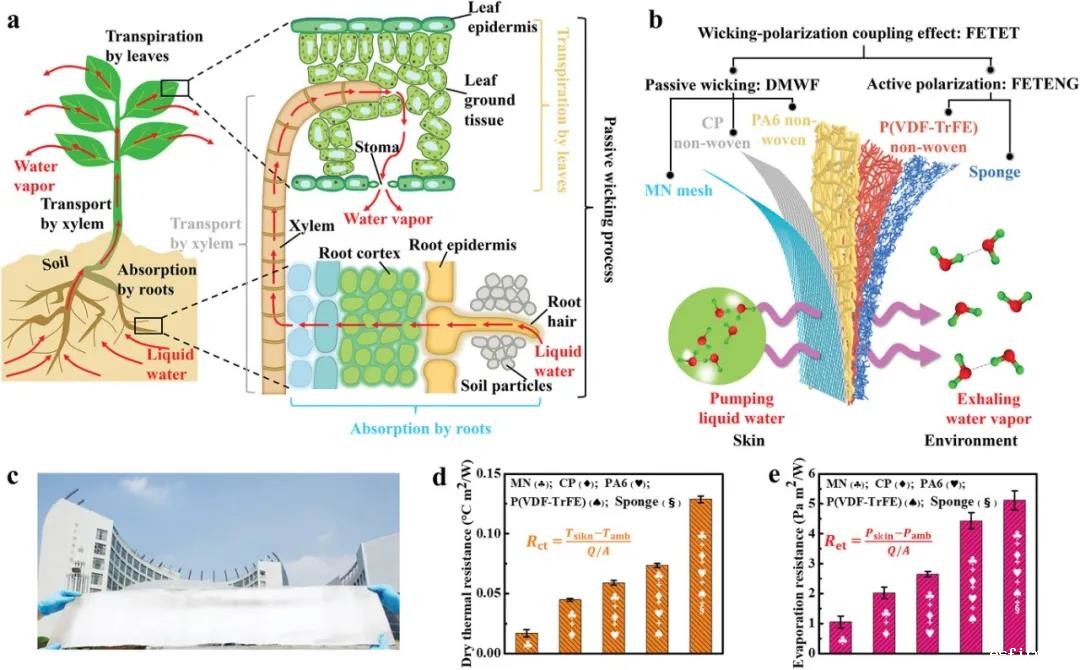 FETET包括改性尼龙(MN)网眼、纤维素/聚酯(CP)非织造布、聚酰胺6(PA6)亲水性纤维膜、聚偏二氟乙烯-三氟乙烯(P(VDF-TrFE))纤维膜以及硅橡胶包裹的导电海绵。湿热性能测试表明它具有优异的导热性,并且在摩擦电蒸发冷却过程中能保持良好的传热能力。