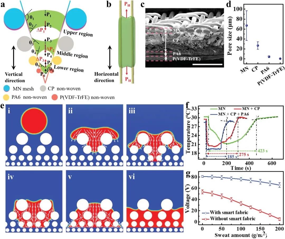 研究表明,整个芯吸过程是垂直方向上的定向且不可逆过程。另外,沿着纤维通道水平方向的拉普拉斯压力也将加速汗液在膜表面的扩散。被动芯吸过程源于不同层之间的润湿梯度和孔径,汗液流过MN层到达CP层和PA6层。PA6纳米纤维对汗液具有更高的渗透和扩散驱动力以及更大的比表面积,因此蒸发更快。