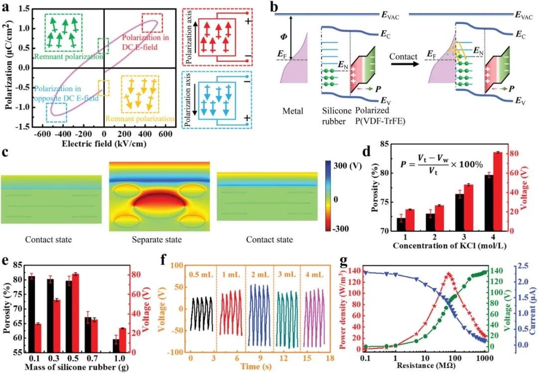 为了实现芯吸-极化耦合效应,需要铁电增强的摩擦电场来促进液态水的蒸发。研究者通过高压静电纺丝制备了自极化P(VDF-TrFE)纤维膜,并且电场下的铁电纤维膜可以切换偶极子的排列方向。最终,FETENG借助铁电极化和摩擦电场之间的协同作用产生较大的输出,当负载电阻为60 MΩ时,其最大瞬时功率密度约为135 W/m3。