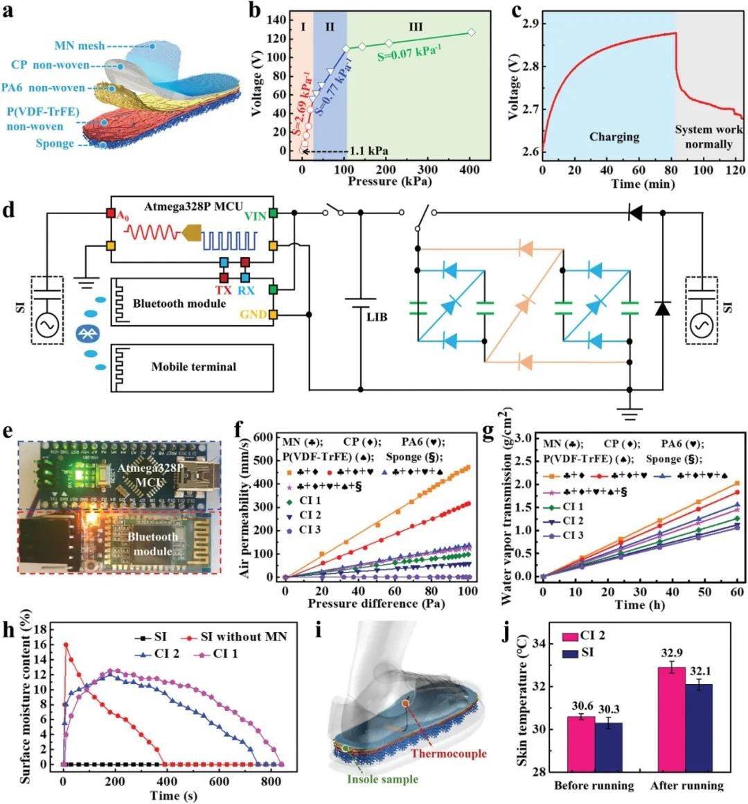 此外,FETET智能鞋垫还可将人体步行信号通过芯片和蓝牙模块无线传输到手机。更重要的是,在摩擦电蒸发的刺激下,鞋垫具有良好的湿热性能。新型铁电增强摩擦电蒸发纺织品可应用于人体运动的自充电和自感应无线监控系统,以及智能和高性能服装的开发,为传统服装行业带来创新。