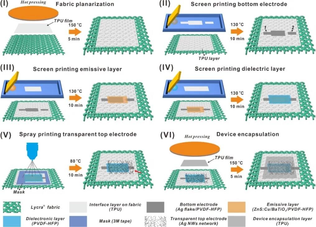 在织物上制备ACEL器件的流程包括:(1)织物表面平整化。在织物表面热压一层TPU薄膜来使其表面更光滑;(2)丝网印刷底电极。将图形化弹性导电银浆丝网印刷在平整化后的织物上,标记为1号和2号电极,1号电极与底电极相连,2号电极与随后喷印的透明顶电极相连;(3)丝网印刷发光层。将电致发光复合浆料丝网印刷在底部电极上,得到均匀致密的复合发光层;(4)丝网印刷电介质层。将电介质层丝网印刷在发光层之上,使其表面平整化以防止电极之间的短路;(5)喷印透明顶电极。通过在电介质层上喷涂AgNWs油墨来沉积透明顶电极,透明顶电极覆盖整个发射层并与2号电极相连;(6)器件封装。将TPU薄膜层压在器件的表面进行封装。