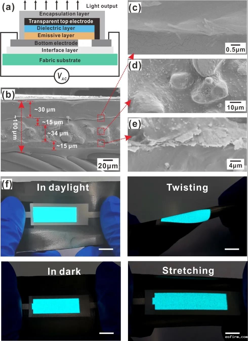 为解决上述问题,中科院苏州纳米所联合浙江师范大学的研究人员采用全印刷的方法在弹性织物上制作出了大尺寸、高机械强度的交流电致发光器件(ACEL),并验证了该器件卷对卷生产的可能性,为织物基可穿戴显示器未来的产业化应用提供了理论基础。