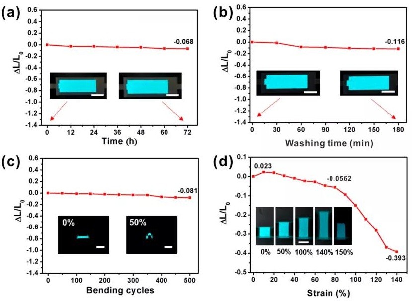 对器件在拉伸性、机械耐久性、耐水洗性和高温高湿环境下的发光性及稳定性进行测试,结果该器件具有优良的机械稳定性和环境适应性。当器件的拉伸应变为80%时,亮度仅下降了5.62%;弯折50%循环500次后,亮度从215.26 cd/m2降低到197.72 cd/m2;经过72h的高温高湿测试和3h的水洗测试后,器件的发光稳定性几乎不受影响。
