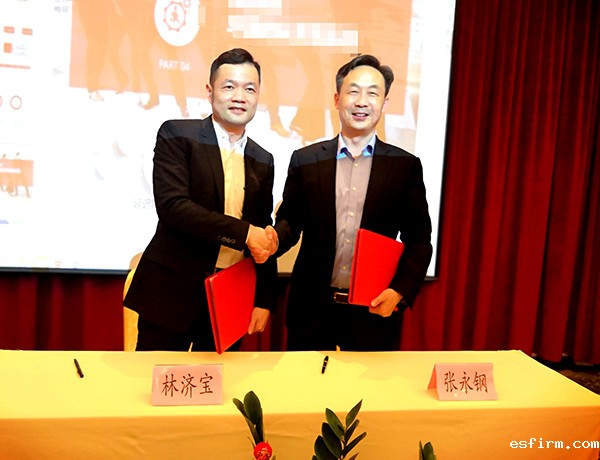 光山白鲨针布有限公司董事长张永钢、福建旭源有限公司董事长林济宝代表双方企业签订合作订单。