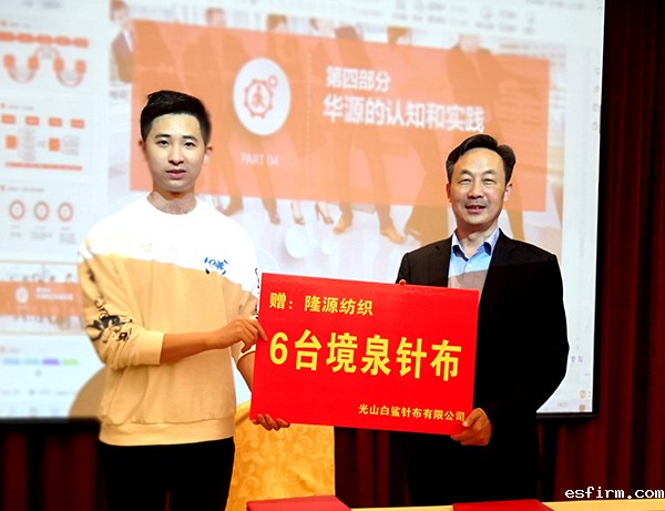 同时,光山白鲨针布有限公司赠送福建隆源有限公司6台境泉针布,张永钢董事长与隆源纺织郑俊豪参与赠送仪式。
