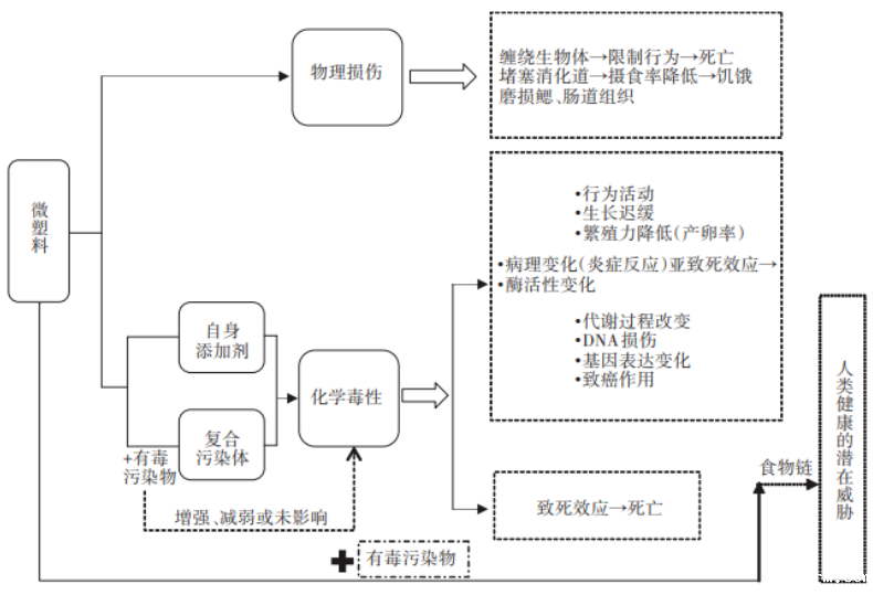 微塑料颗粒进入大自然后不仅会破坏生态环境,还会被水生和海洋生物摄取,对生物本身造成物理危害,另外,由于微塑料不易降解,使它很容易在不同的生物体内富集并随着食物链传递最终可能会对人类健康造成有害影响。