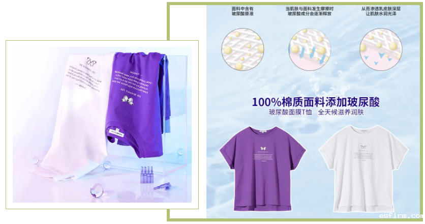 自2019年开始,中国内衣品牌也相继推出玻尿酸护肤产品,例如THREEGUN美肤修身内衣系列、如氧玻尿酸美肤保暖内衣、欧妃倩玻尿酸连体塑身衣等。2020年夏季,HA成为不少知名服装品牌的新宠,如Cache Cache水光美肤玻尿酸T恤、乐町黑科技玻尿酸T恤、韩都衣舍玻尿酸T恤和牛仔裤等。