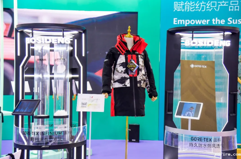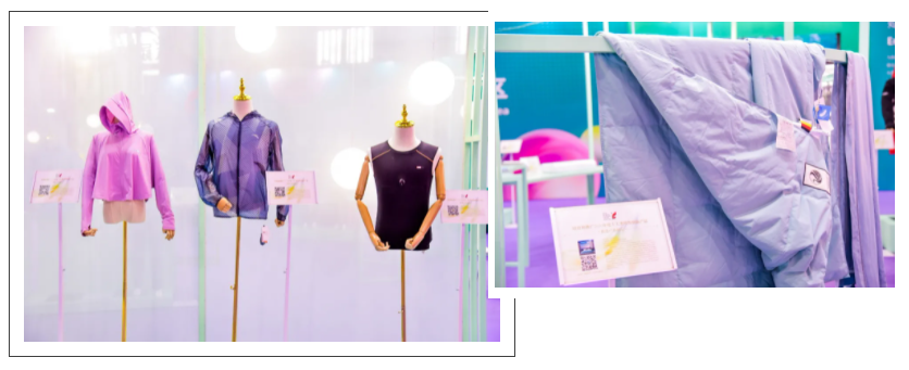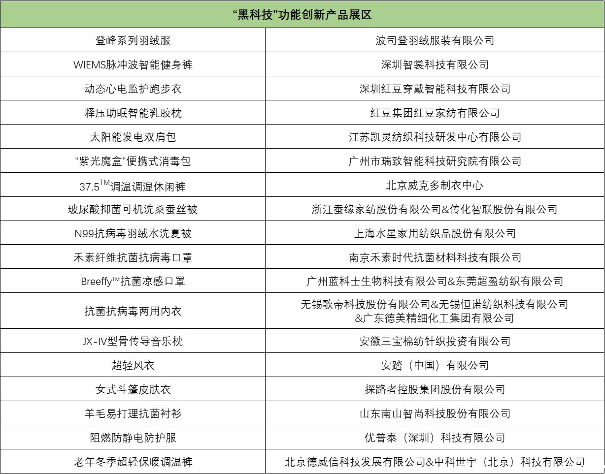 “黑科技”功能创新产品展区:展现了波司登、安踏、探路者、红豆集团等品牌企业在智能可穿戴、纳米保温材料、相变调温调湿材料、轻量多功能、抗菌抗病毒等方面的最新研究进展和终端应用,展示中国纺织服装企业的创新实力。