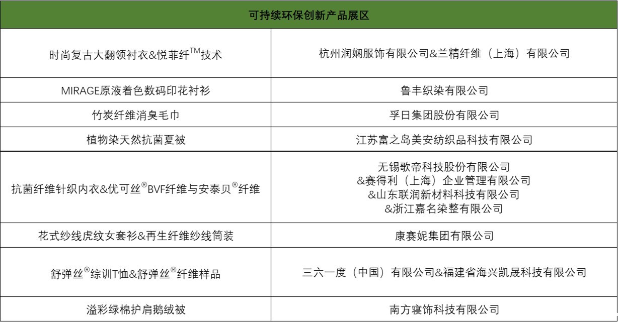 可持续环保创新产品展区:汇聚了兰精集团、赛得利、伊芙丽、361°、孚日家纺、南方寝饰等国内外知名纤维企业、服装和家纺品牌企业的最新生态环保创新产品,搭建上下游企业交流平台,促进产业对接、协作,推动全产业链合作共赢、协同发展。