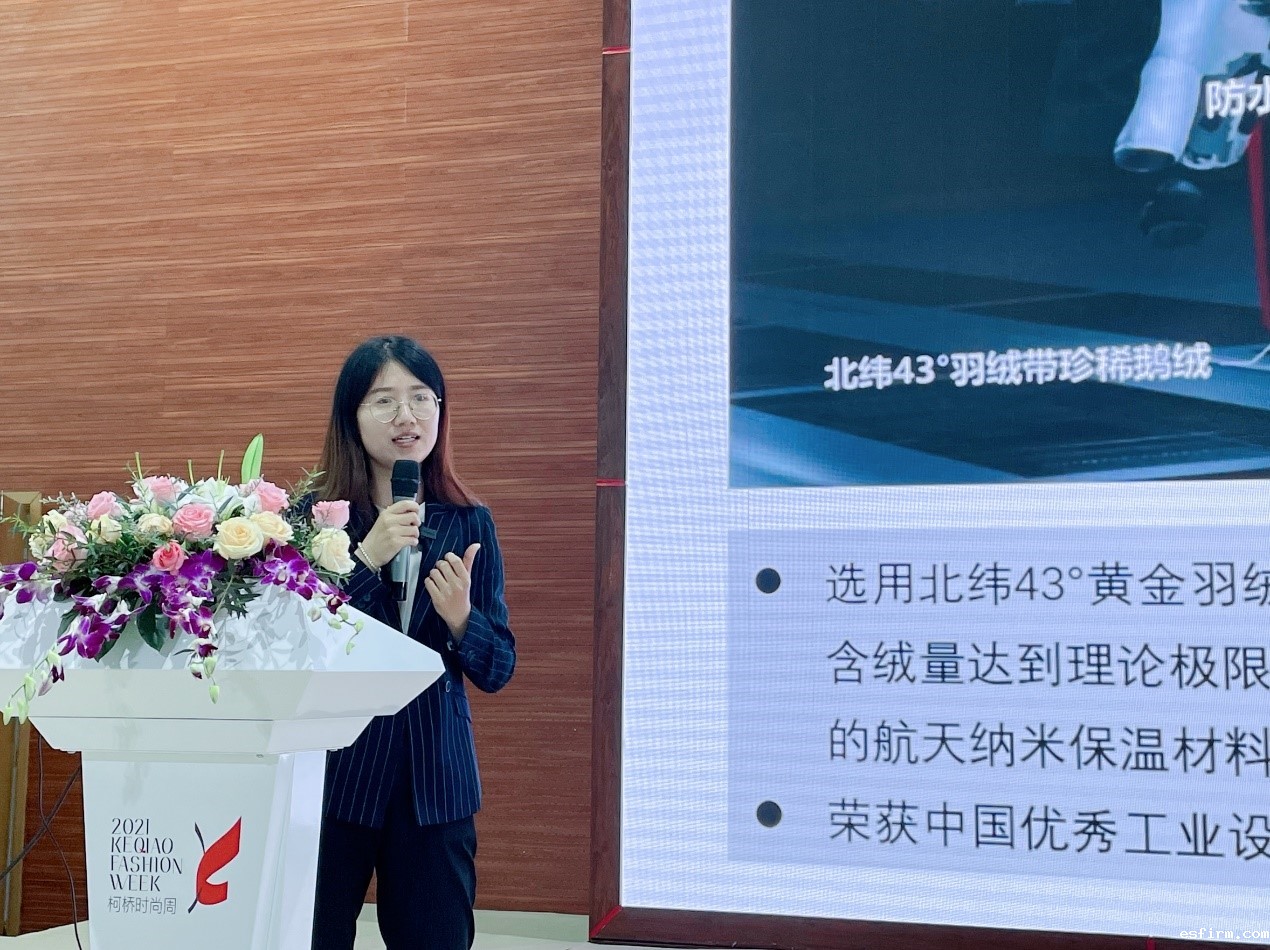 陈佳从“培育和推广十大类纺织创新产品”项目介绍出发,对项目申报流程进行了详细介绍。并从新材料+新工艺+新设计、非遗元素再创新、智能响应实时监测、多功能叠加、功能新材料的创新应用、生态环保材料及技术的应用等角度解读了“2020年十大类纺织创新产品获选服装产品”的亮点,最后从时尚、科技、生态等视角与观众共同探讨了服装产品的未来发展趋势。