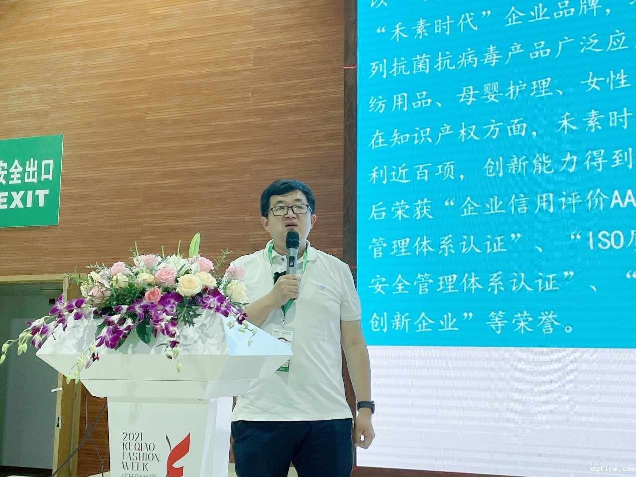 南京禾素时代抗菌材料科技有限公司副总经理方斌作“基于PHBV的抗菌消臭功能性纤维在纺织品的应用”报告。方斌指出,禾素纤维是其基于聚乳酸(PLA)和聚羟基丁酸戊酸共聚酯(PHBV)两种生物基可降解高分子树脂,通过流变改性,反应性共混和熔融纺丝制备而成。禾素纤维中的低聚合度PHB可以破坏细菌的生物膜和细胞壁,致使细菌细胞内物质泄漏而杀灭细,还可破坏病毒包裹RNA的脂类和蛋白质,使病毒死亡。禾素时代通过工艺控制,使纤维表面具有一定浓度的低聚合度PHB,从而使禾素纤维达到稳定的抗菌抗病毒效果。