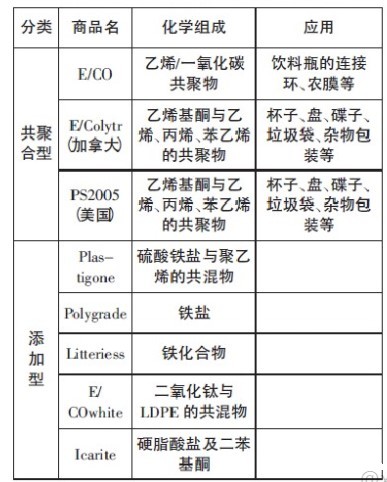 在材料分子链中引入对光敏感的羰基等基团,当材料在光照作用下时,环境中的氧气、大气中的水分等使材料发生氧化还原反应,分子链发生断裂,宏观上表现为材料的老化,如变脆、变软、发硬、发黏发黄,力学性能渐渐丧失,形貌形态解体,最终材料降解。一方面,光因素直接决定材料的降解程度,材料的曝光面可彻底降解,但背光面降解则比较难;另一方面,材料降解与光敏剂的含量有关,如E/CO就属于乙烯/一氧化碳共聚物合成类型的降解材料,其降解速度与主链中的酮基含量有关,光辐射充足的情况下,数天就能完全降解。利用这一原理,可以在某些材料中添加光敏剂,即能以极低的成本、简单的工艺使普通材料获得光降解性能。如在聚丙烯(PP)、聚乙烯(PE)等聚合物中添加适量的酮类、胺类光敏剂,均可使其获得优良的光降解性。这类光降解塑料的降解诱导期可控制在两个月以上,但降解进程可控性较差。