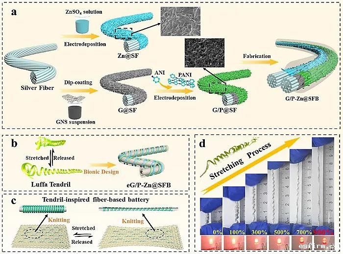 为解决以上问题,青岛大学智能可穿戴技术研究中心的研究者受藤蔓的生物结构启发,设计了一种具有螺旋结构的超拉伸纤维基锌离子电池(G/P-Zn@SFB),他们将纤维电池以螺旋结构紧密缠绕在弹性丝表面,并通过针织工艺将其制成织物。一系列性能测试验证了其在可穿戴能源纺织品应用方面的潜力。