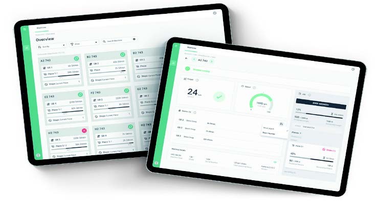 不论设备位于何处,客户需要什么信息,仪表盘都可以近乎实时地提供数据。在概述页面上,每台设备的名称、将要更换盘头的时间都会显示出来。其他显示功能还包括加工织物时的停机次数和剩余时间、每个作业的布卷数量等。与概述页面类似,每台设备的详细页也被简化。