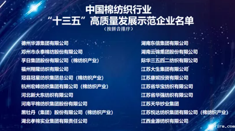 中国棉纺织行业协会根据“十三五”期间企业营业收入、竞争力排名等综合情况,最终安徽华茂集团有限公司等21家企业荣获中国棉纺织行业“十三五”高质量发展领军企业荣誉称号;德州华源集团有限公司等41家企业荣获中国棉纺织行业“十三五”高质量发展示范企业荣誉称号。
