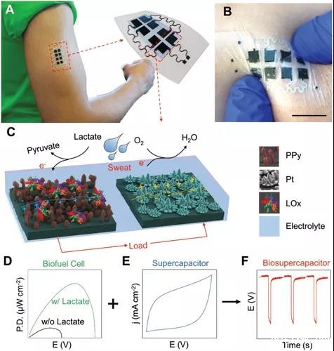 基于上述背景,格勒诺布尔-阿尔卑斯大学与UCSD大学合作研究了第一个全打印、双功能、可伸缩、可穿戴的超级电容器,用于收集和存储汗液中的能量,同时保持与人体皮肤的密切接触。这款可穿戴混合设备兼具BFC和SC功能,已被证明能够提供高功率脉冲,并通过人体汗液中的乳酸生物燃料的酶氧化快速自我充电。