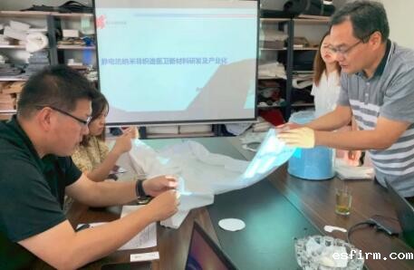 在九一高科厂区的集装箱体会议室中,王荣武展示了该项目迭代生产技术制作出来的产品,从面料到面膜等终端产品一应俱全。静电纺制备的微纳米纤维为高附加值、功能性微纳米非织造材料产业化提供了解决方案。在水处理、口罩等领域应用效果显著,此外还可用于伤口辅料等领域。