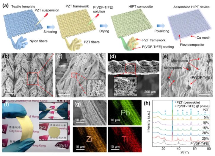 在此背景下,香港城市大学的研究团队基于模板辅助的溶胶-凝胶法,研发了一种柔性透气并具有高输出的三级结构压电陶瓷复合织物,其内部独特的多级结构能够有效强化机械性能。