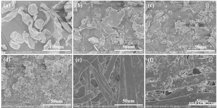 (a-d)分别为机械处理0h、4h、8h、12h的片状纤维素;(e)未改性纸;(f)疏水纸的SEM形貌图