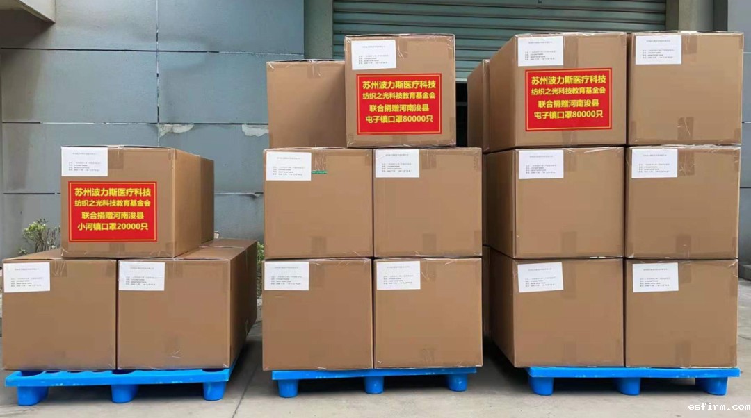 苏州波力斯医疗科技有限公司、纺织之光科技教育基金会联合向河南鹤壁市浚县屯子镇和小河镇捐赠一次性防护口罩10万只。