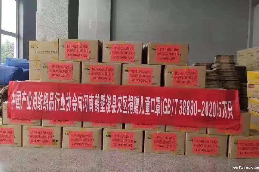 得知浚县灾区紧缺儿童口罩等救灾防疫物资,中国产业用纺织品行业协会通过纺织之光科技教育基金会紧急向浚县屯子镇、小河镇人民政府捐赠儿童口罩5万只。此次捐赠的口罩由思迈(青岛)防护科技有限公司生产,目前已一次性运往浚县灾区。