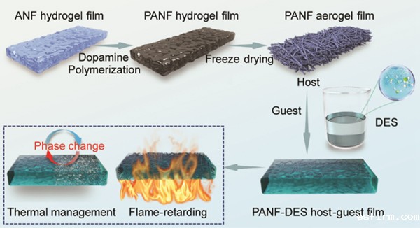 图1.PANF-DES主客体复合薄膜的制备及阻燃和热管理功能示意图