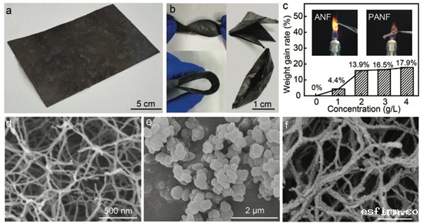 (a-b)光学照片;(c)不同浓度多巴胺溶液对芳纶气凝胶薄膜增重率的影响;(d)ANF;(e)聚多巴胺;(f)PANF的微观形貌。