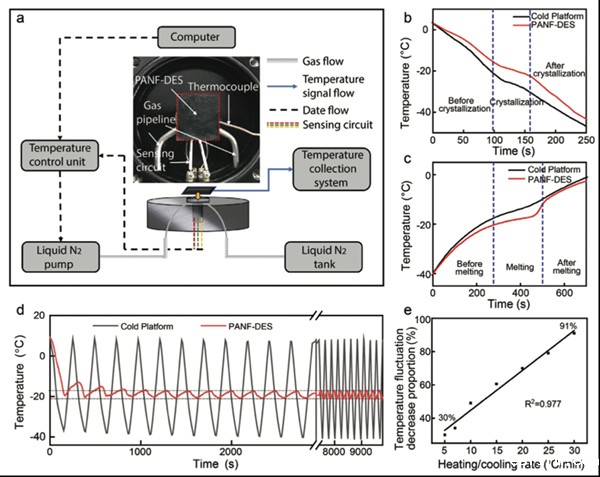 该研究将三元低共熔相变材料填充到PANF气凝胶薄膜中,得到的PANF-DES主客体薄膜相变温度为-21℃、相变焓高达225J/g,且具有优异的阻燃性,其热释放量和气体释放量均比商业阻燃相变薄膜低一个数量级,以垂直、弯曲、平行状态接触酒精灯火焰均无明火,只有部分碳化,以放热少、火焰传播能力小的优良阻燃性能保证了实际应用的安全性。此外,研究者通过搭建简易装置,探索了PANF-DES主客体薄膜在低温电子器件上的热管理性能。PANF-DES主客体薄膜可通过熔化或结晶过程吸收或释放大量热能,减缓升温或降温速率;在循环升降温过程中,PANF-DES主客体薄膜可削减温度波动,维持电子器件温度相对稳定。因此,此PANF-DES主客体薄膜可应用于低温环境下电子元器件的温度管理。