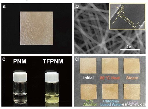 薄膜(TF)涂层电纺聚丙烯腈(PAN)纳米纤维膜(TFPNMs)通过静电纺丝技术制造,并通过界面聚合过程功能化,产生具有可变端基的浅黄色织物。与PP相比,TFPNMs具有更强的表面极性,可以通过不同的涂层使其改变。为了进一步评估TFPNM的稳定性,研究团队将纤维膜暴露在高温(>80 °C)、蒸汽气氛(>100 °C的高湿度)、75%酒精、氯化物消毒水和紫外线(UV)光等环境中进行测试。研究发现,TFPNM没有明显的损坏和重量损失,表明纤维几何形状没有发生变化。与初始TFPNM相比,后处理的TFPNM的表面极性保持不变。稳定的表面极性可以使膜与PMs/气溶胶之间形成稳定的极性相互作用,使TFPNMs在各种恶劣条件下具有可重复使用的巨大潜力。