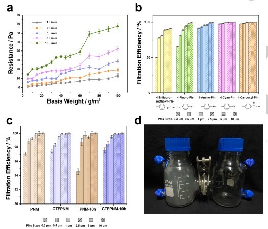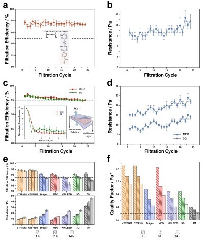 研究人员首先检查了TFPNMs对各种尺寸颗粒物(PMs)的捕获能力,以模拟其在危险空气质量条件下的空气过滤性能(图2)。实验室使用燃烧的香(含有多种污染物,如PM、CO、CO2、NO2等)来呈现有害颗粒物的水平。所有TFPNM的最佳基重控制在10 g/m2。具有不同表面极性的五件TFPNMs在过滤效率方面表现出较大的差异。表面极性从最低到最高对应的纤维膜对PM0.3的过滤效率结果从50.00%到97.45%不等。其中,具有氰基和羧基的TFPNMs表现出非常高的过滤效率,超过97%。为了研究TFPNMs的长期有效性,在有害空气下放置10h,测试了具有与PAN分子相同的末端基团TFPNM(CTFPNM)的质量状况。结果显示PAN纳米纤维膜(PNM)在10 小时后,对PM0.3的过滤效率从97.10%下降到94.57%,PM2.5的过滤效率从99.67%下降到99.42%。然而,CTFPNM的过滤特性保持稳定,10小时内对PM0.3和PM2.5的过滤效率分别超过97.00%和99.90%。