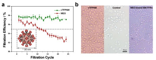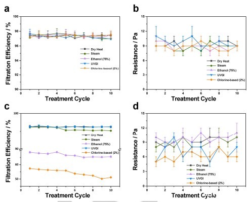 将cTFPNM放置在柯萨奇B4病毒(CV-B4)和一种微小的RNA病毒(27~30 nm)气溶胶中以评估其过滤效率。并对N95 FFR(MEO品牌)进行了病毒过滤测试。结果显示,cTFPNM在24小时后仍保持N97级过滤效率,而MEO牌N95 FFR的过滤效率在24小时后降到95%以下。为了研究TFPNMs的可重用性,对cTFPNMs进行了五种处理方法:80 ℃热处理;蒸汽(100 ℃热基蛋白质变性);75%酒精(蛋白质变性);家用氯基溶液(细胞变性,有化学损伤);紫外线杀菌照射(DNA/RNA 破坏,UVC 254 nm)。在第一个处理周期后,cTFPNMs所有过滤效率保持在N97水平不变,压降保持在9~10 Pa。相比之下,N95 FFR在第一次循环后经过各种处理显示出不同的过滤性能。加热和紫外线杀菌照射(UVGI)可以保持大多数N95 FFR的过滤特性。然而,基于溶液处理的样品过滤效率急剧下降到50%~80%。