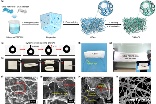 近日,东华大学俞建勇院士及丁彬研究员带领的纳米纤维研究团队报道了一种超柔性网笼结构纳米纤维气凝胶。通过在SiO2纳米纤维/硅烷溶胶/卤胺改性剂的分散液中进一步引入细菌纤维素(BC)纳米纤维,经冷冻干燥后,BC纤维在SiO2纤维框架上形成二级精细网络,从而构成了纤维网笼结构,在抗菌抗病毒空气过滤材料领域极具应用潜力。