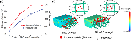 研究者考察了不同BC纳米纤维含量的气凝胶对PM0.3的过滤效率和压阻,随着BC含量的增加,气凝胶的过滤性能和压阻都逐渐增大。当BC纤维含量为20wt%时,气凝胶的过滤效率可达到99.97%,此时压阻为189Pa。通过进一步构建SiO2纤维气凝胶和网笼结构纳米纤维气凝胶的三维结构模型,设置空气参数和过滤颗粒的粒径,可以得到材料所受到的空气阻力分布情况和对固体颗粒物的拦截情况。相比于SiO2纤维气凝胶,网笼结构气凝胶可拦截几乎所有的颗粒,气凝胶内部的BC二级网络可有效拦截微小颗粒物。此外,还可通过辨别空气阻力场的颜色判断阻力大小。