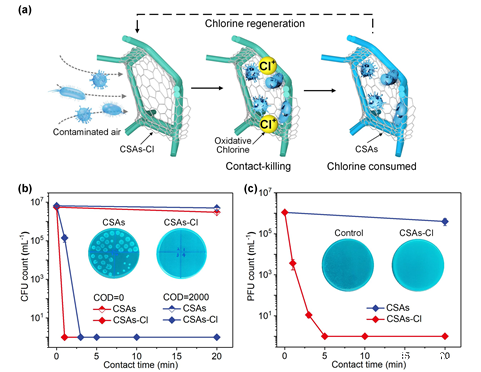 在实际应用过程中,当被污染的空气通过氯化处理后的气凝胶时,纳米纤维网笼结构将对污染物起到拦截作用,尤其是BC精细网络会拦截细菌、病毒和微小颗粒物质,纤维网笼上的卤胺抗菌剂活性位点将释放氯正离子以彻底杀灭拦截的微生物,从而避免二次污染。与此同时,气凝胶N—Cl键释放的氯也会被消耗而变为N—H键,当气凝胶再次被氯化时,纤维网络上的N—H键可重新氯化成N—Cl键,实现杀菌杀病毒性能的循环再生。该材料的制备为开发新一代抗菌抗病毒空气过滤材料提供了新思路。