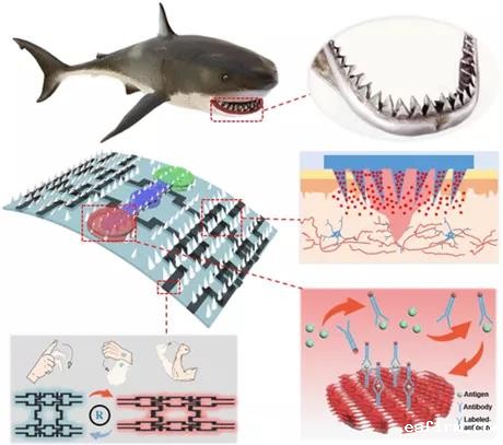 用于伤口智能管理的鲨鱼牙齿微针敷料示意图