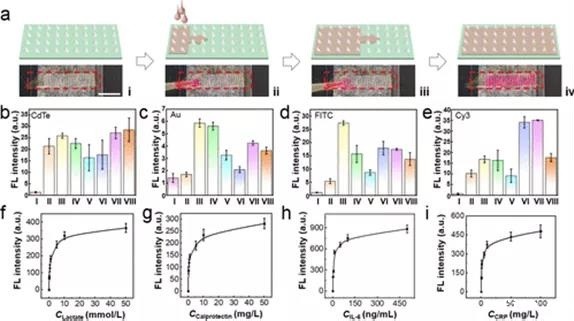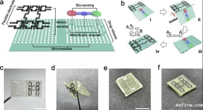 研究人员利用温度响应N-异丙基丙烯酰胺(NIPAM)水凝胶在MN贴片上构建智能药物释放系统。在微针表面引入了多孔IO PC结构增强其药物储存能力。发生感染时伤口区域的温度可高达39.4℃,伤口区域的温度升高会导致温度响应性NIPAM水凝胶收缩,从而释放封装的治疗药物。此外,多功能MN贴片要求将各种功能部件(微针、微流体通道和电极)高度集成到一个完整的贴片中。研究者通过简单的折叠技术制备双面MN贴片,一侧包含用于药物治疗和生化分析的载药微针和微流体通道,另一侧包含用于运动传感的柔性电极。