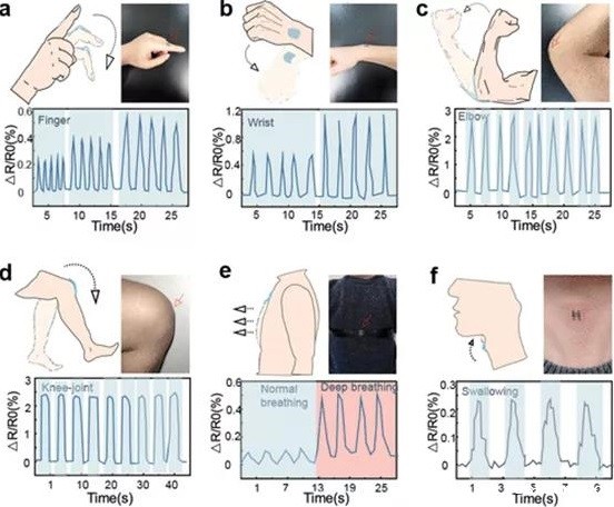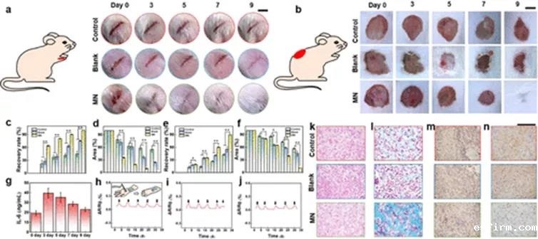 为了验证MN敷料的生化分析能力,使用MN敷料分析样品中包含的乳酸和钙卫蛋白。生物标志物的浓度由检测区域的荧光强度指示。乳酸的荧光强度与浓度范围从0~350 mmol/L呈线性相关。钙卫蛋白的荧光强度和浓度范围从0~300 mg/L呈线性相关。这些结果表明MN敷料能够进行生化分析。为了赋予MN敷料运动感应的能力,在敷料上集成了基于MXene的电路。将敷料分别贴在志愿者的手指、手腕、肘部和膝盖上,然后将其弯曲成不同的角度,并记录相应的阻力变化。结果表明MN敷料具有高灵敏的运动感知能力。为了验证MN敷料促进伤口恢复的能力,动物实验中使用的MN敷料用人表皮生长因子(hEGF)封装。结果表明,载有hEGF的MN敷料处理的伤口表现出更好的恢复能力。